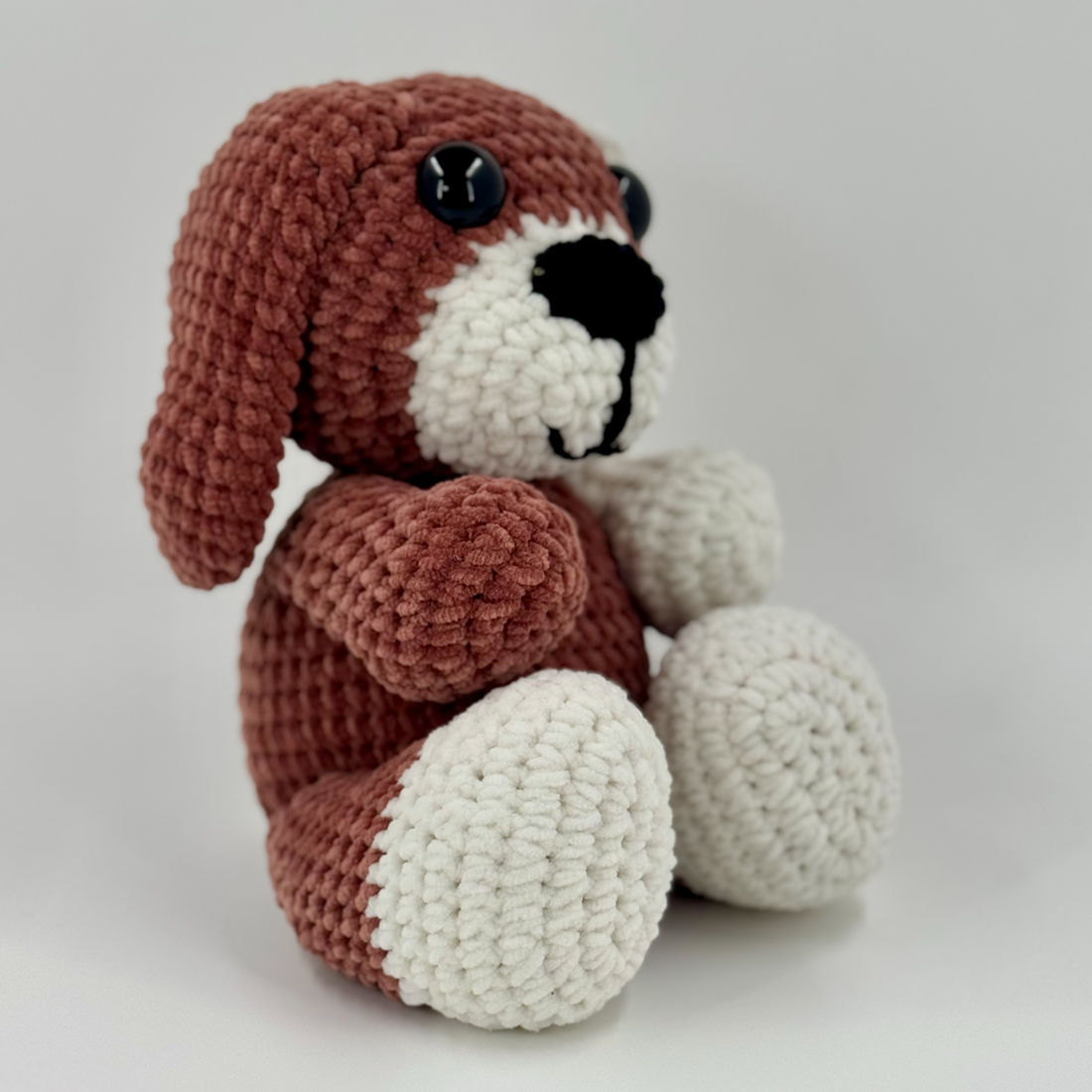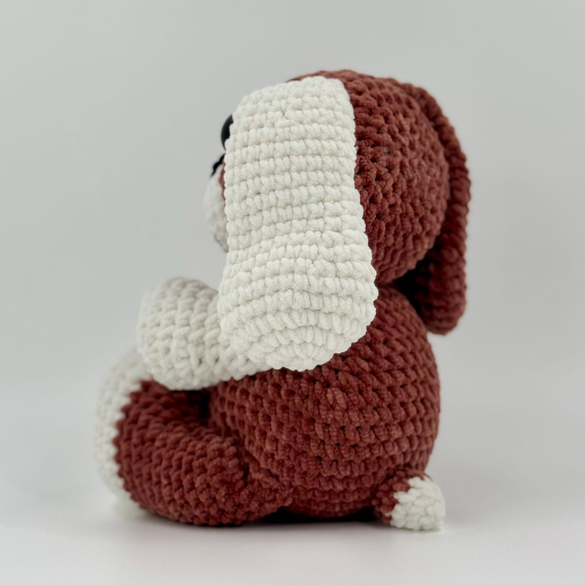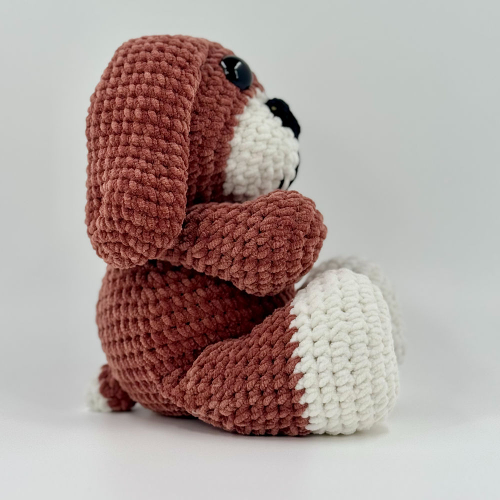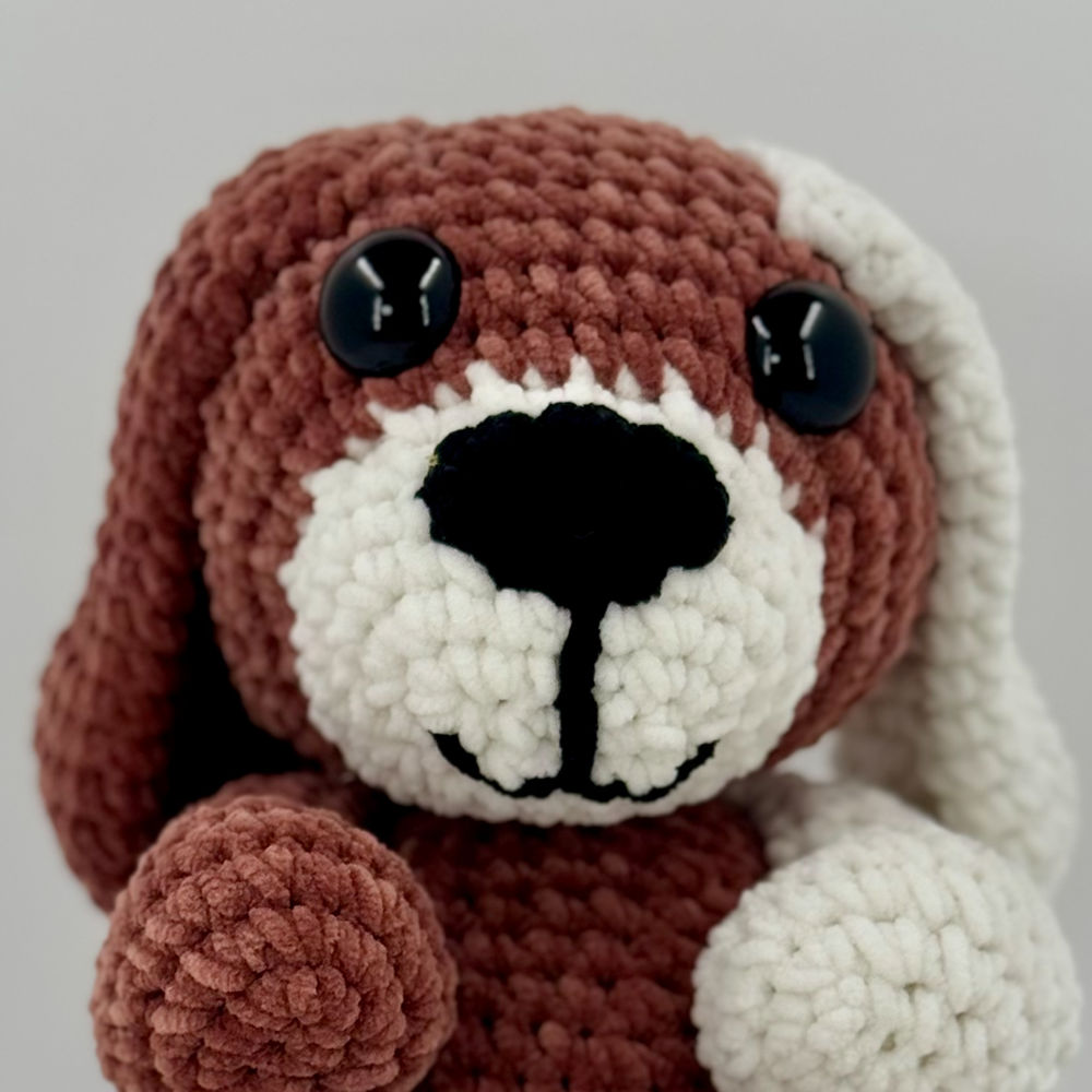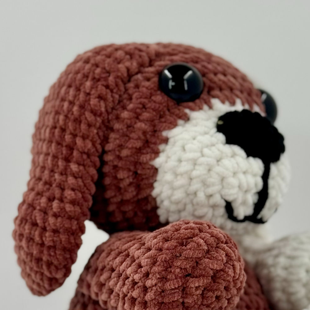 Crocheté avec le fil chenille Toucan fine de Hobbii, il se distingue par ses oreilles tombantes et sa texture veloutée unique.