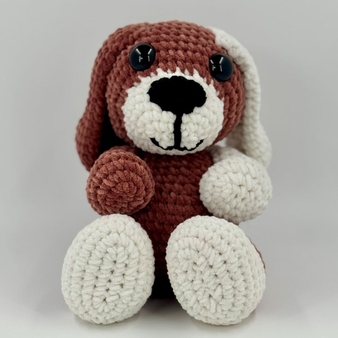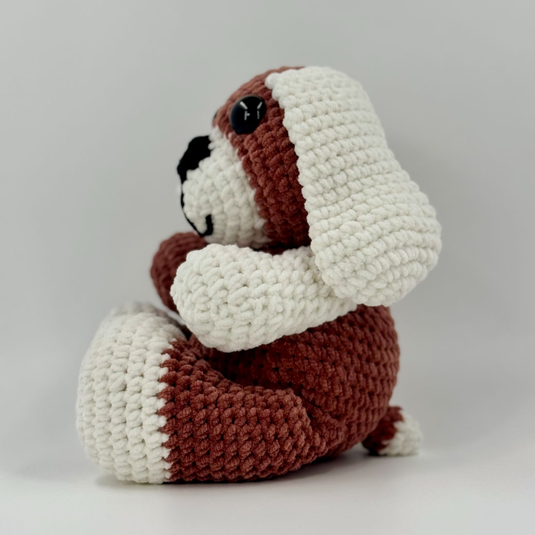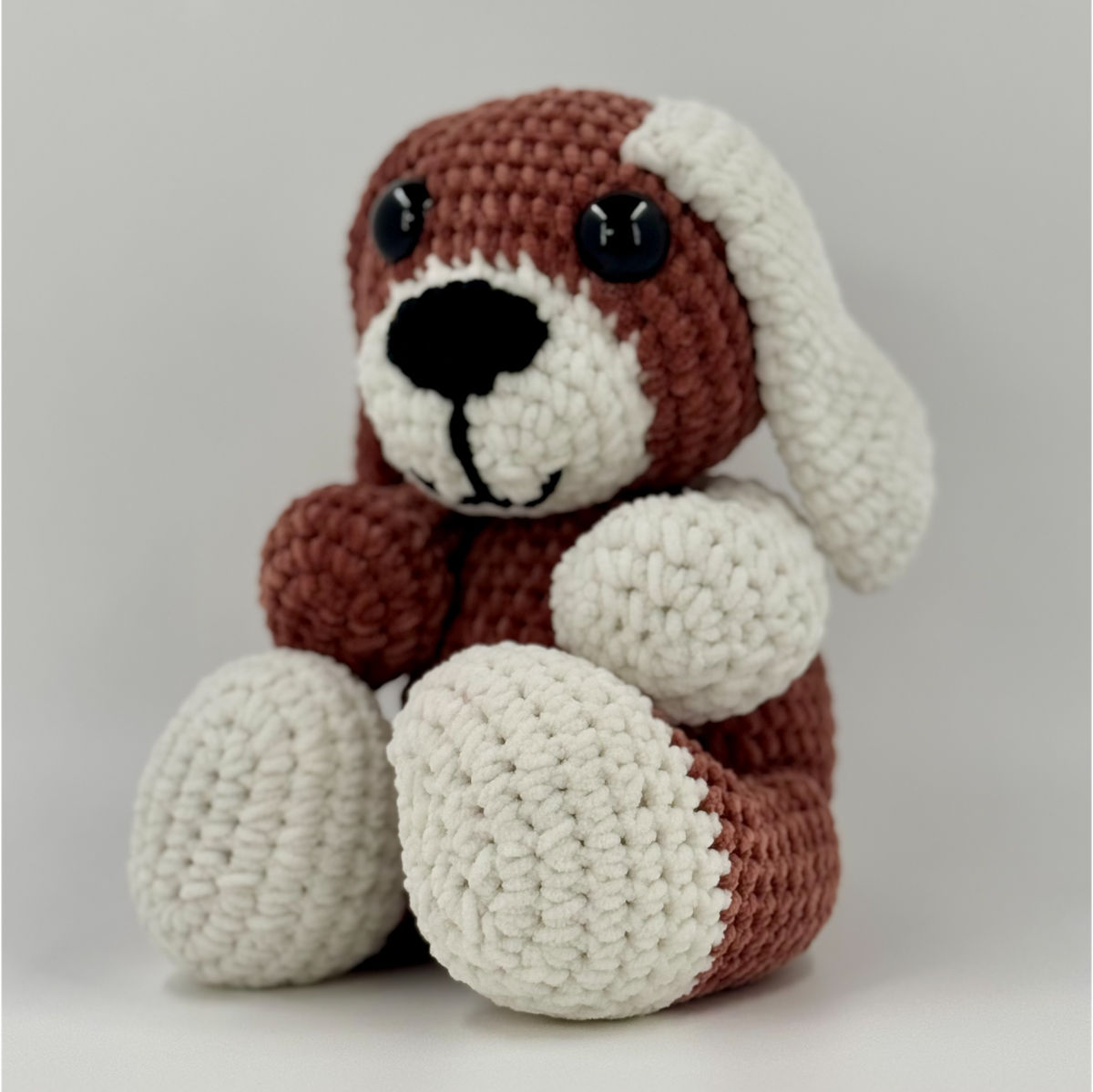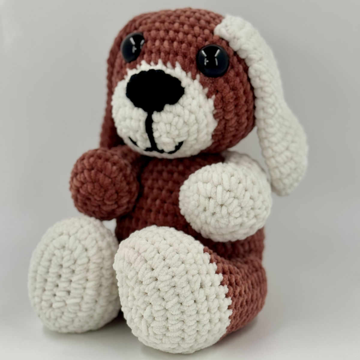 Crocheté avec le fil chenille Toucan fine de Hobbii, il se distingue par ses oreilles tombantes et sa texture veloutée unique.