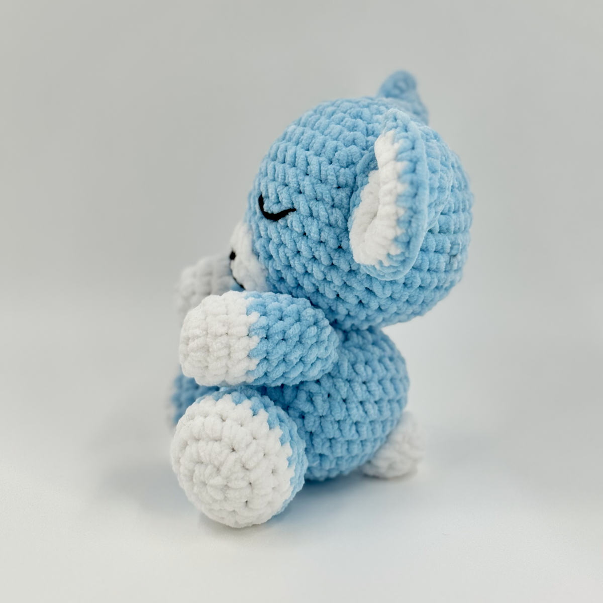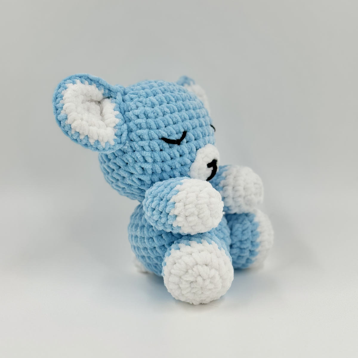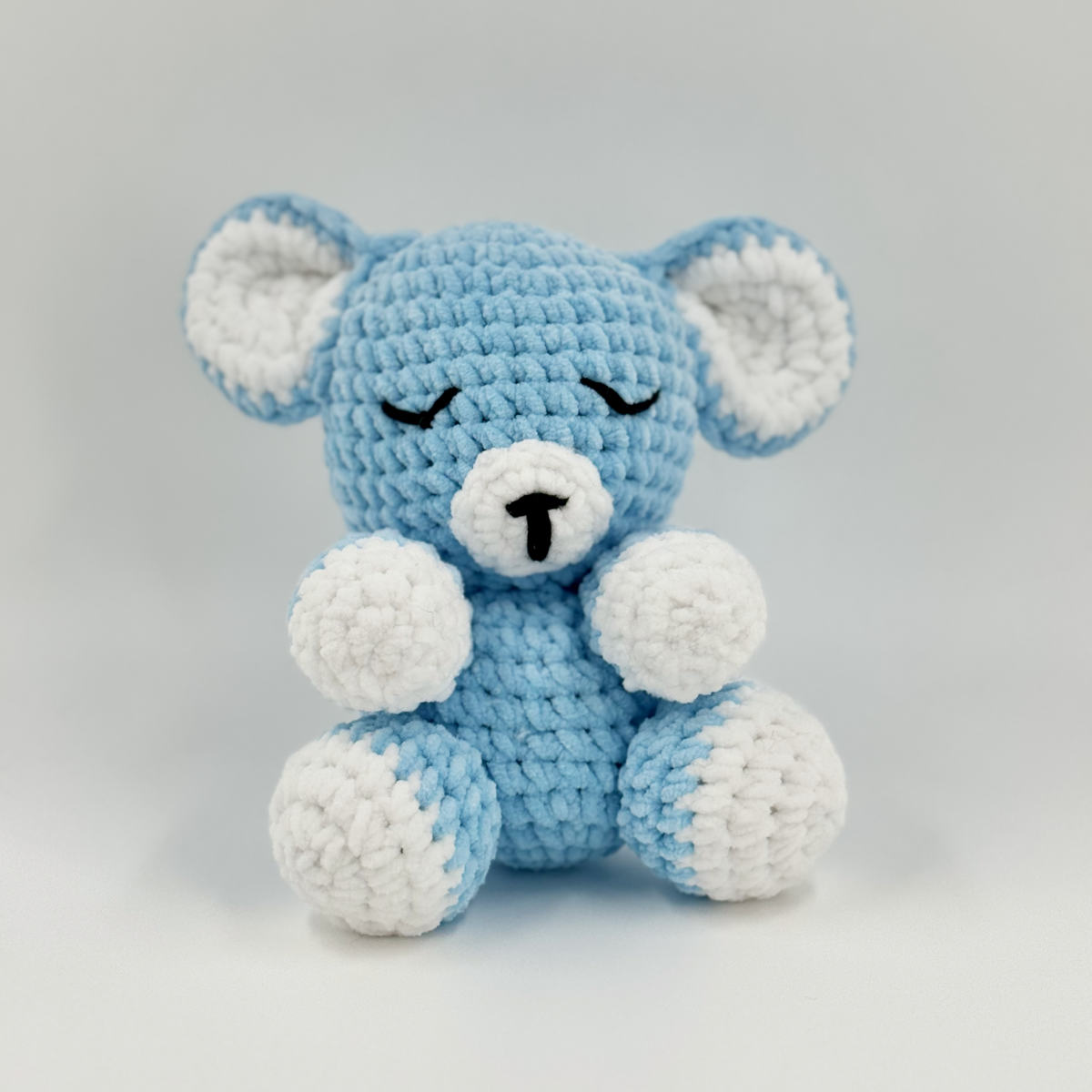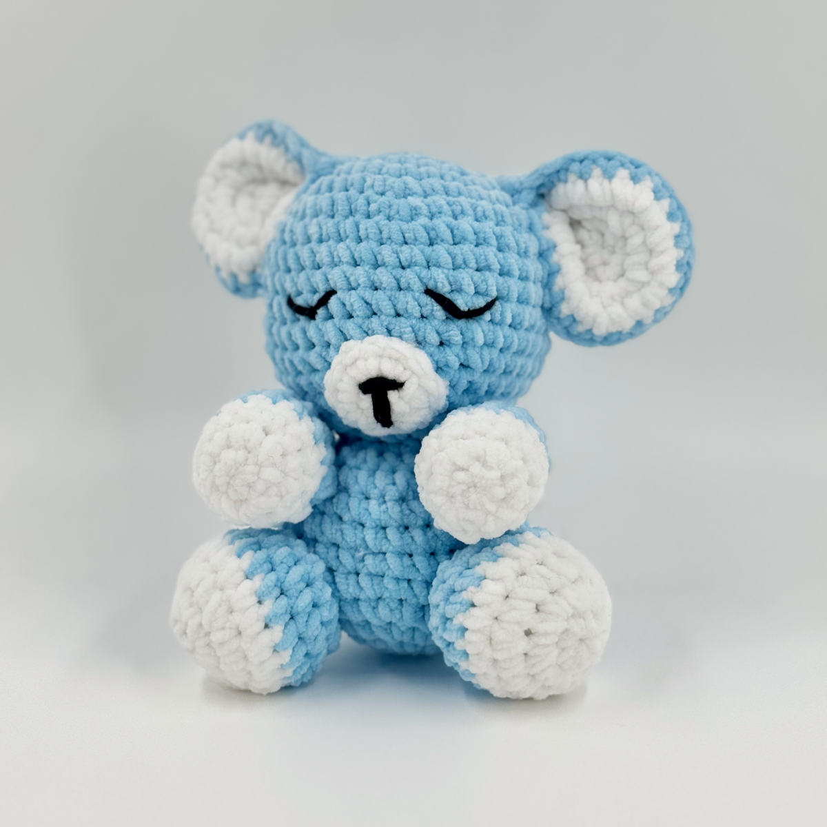 Plongez dans un océan de douceur avec Myosotis, notre petit ours bleu au regard paisible.